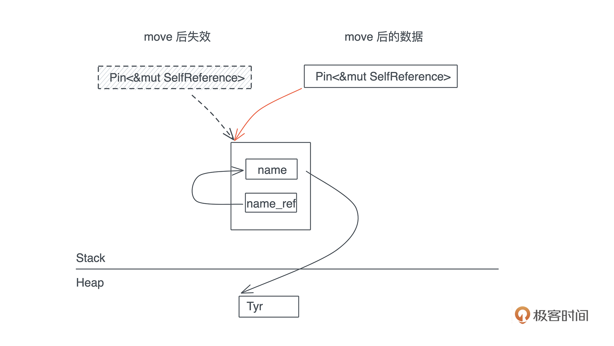 - 但一旦对这个结构做 move 操作,name_ref 指向的位置还会是 move 前 name 的地址,这就引发了问题。看下图: