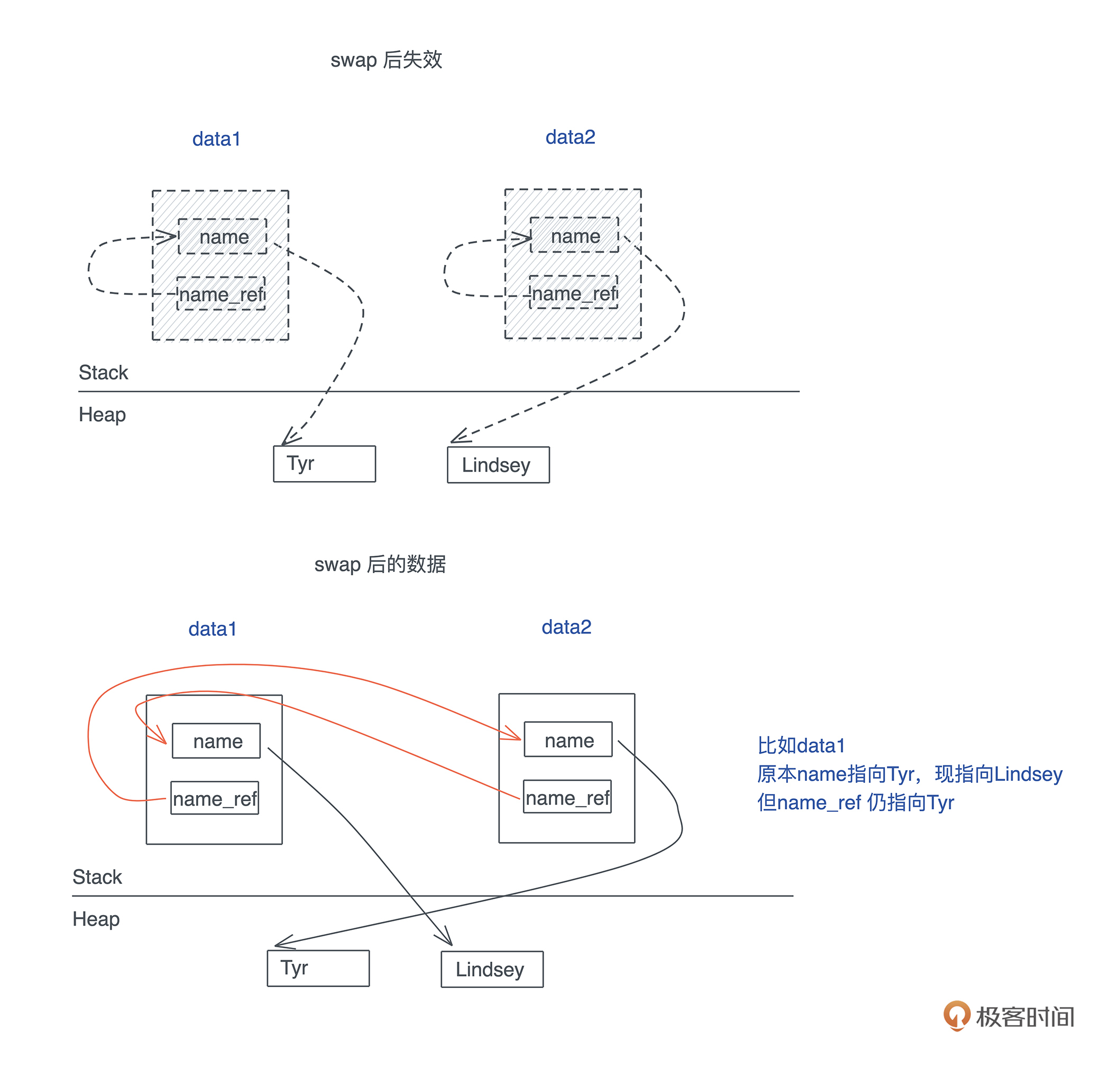 同样的,如果我们使用 std::mem:swap,也会出现类似的问题,一旦 swap,两个数据的内容交换,然而,由于 name_ref 指向的地址还是旧的,所以整个指针体系都混乱了: