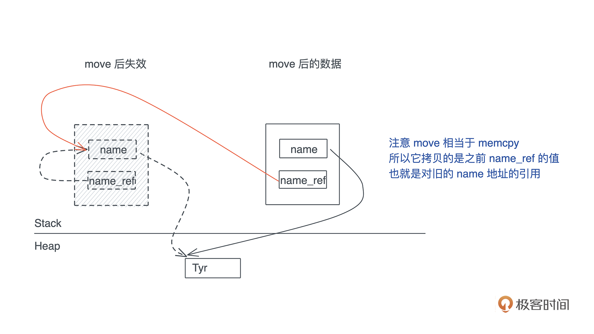 你也许会奇怪,不是说 move 也会出问题么?为什么第二行打印 name_ref 还是指向了 “Tyr”?