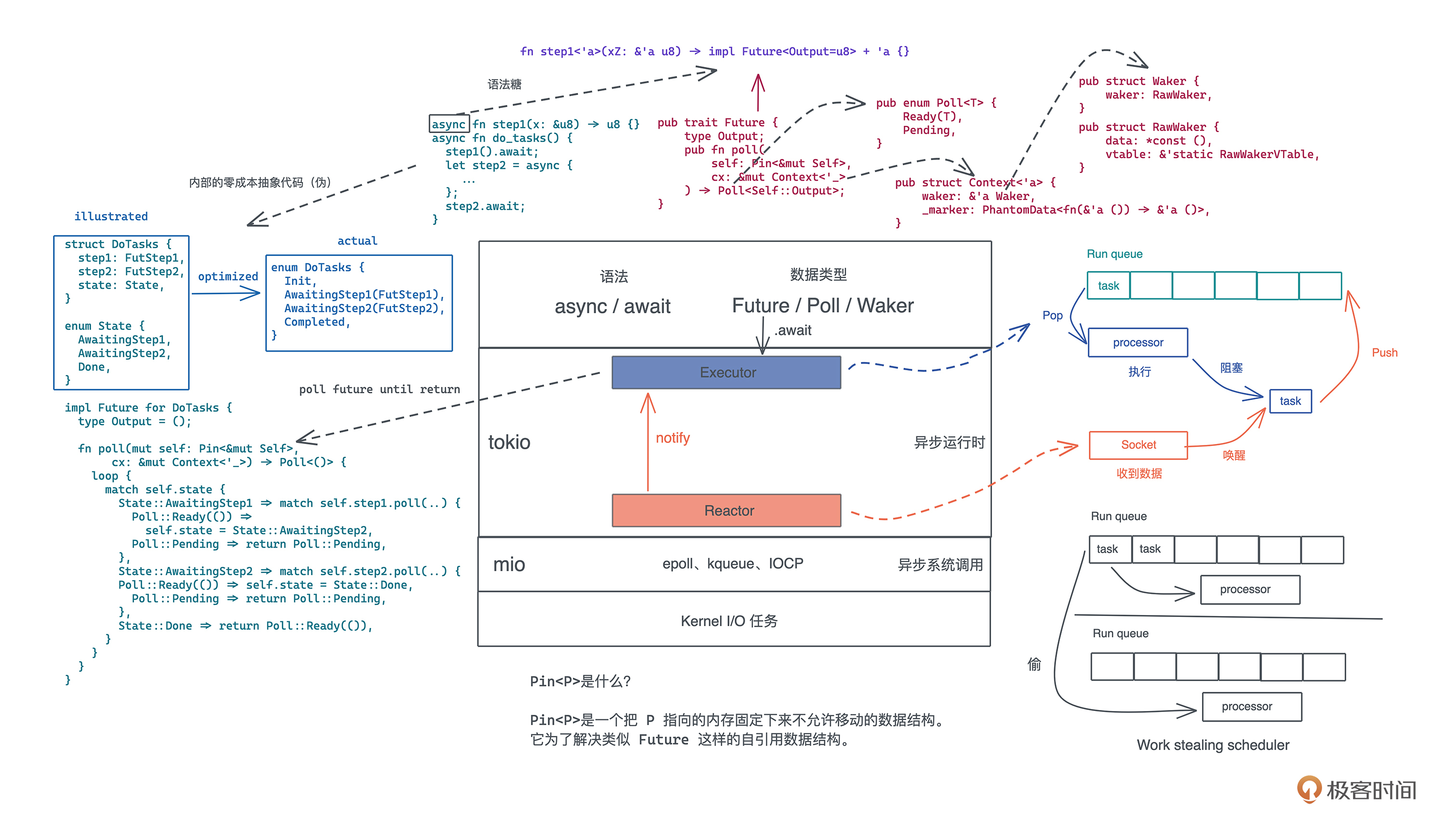 提前说明一下,我们会继续围绕着 Future 这个简约却又并不简单的接口,来探讨一些原理性的东西,主要是 Context 和 Pin 这两个结构: